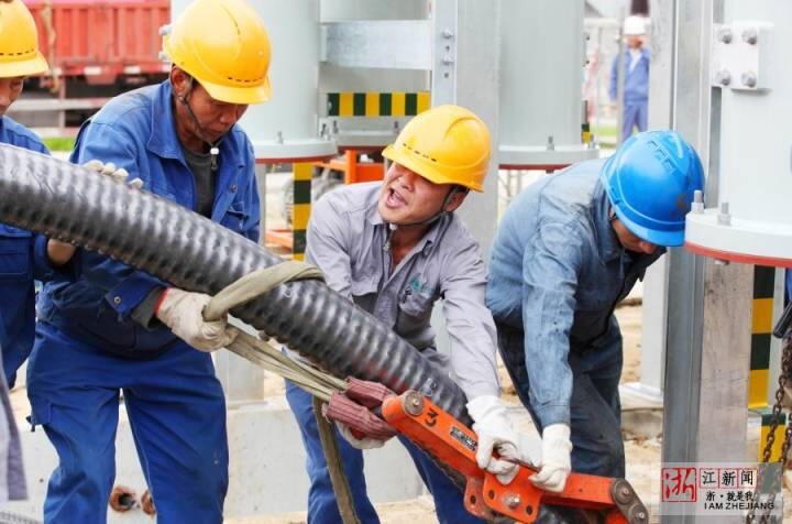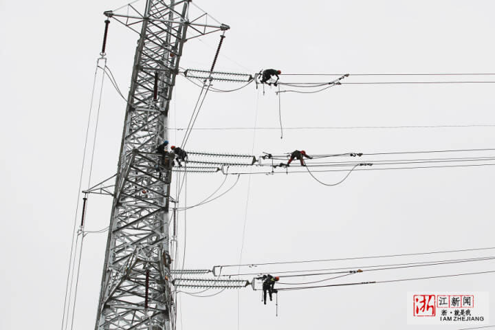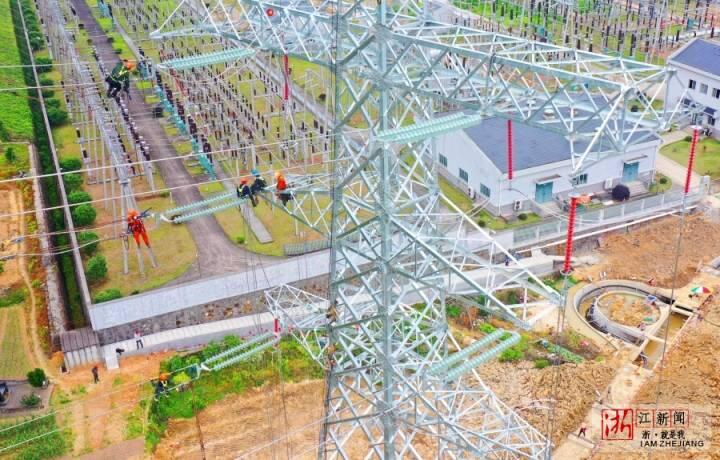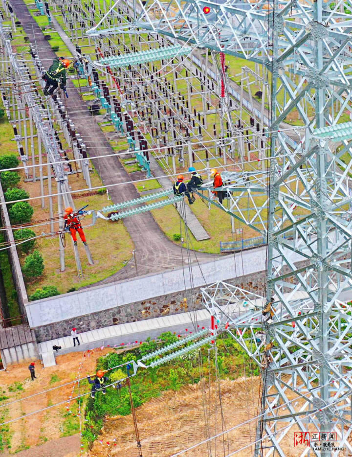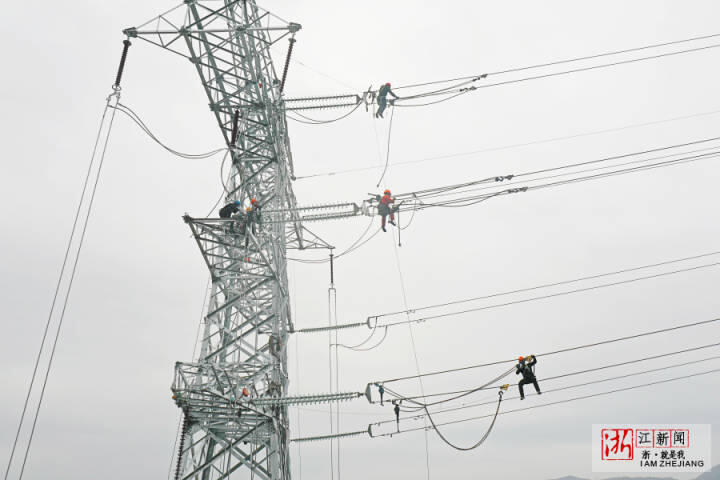 5月3日,“五一”小長假第三天,在浙江省溫嶺市溫嶠鎮(zhèn)上珙村,省重點(diǎn)工程杭紹臺(tái)鐵路的配套工程溫嶺牽引站外部供電項(xiàng)目最后一座鐵塔施工現(xiàn)場(chǎng),高空作業(yè)員在鐵塔上緊線施工,場(chǎng)景就像一曲優(yōu)美的五線譜。