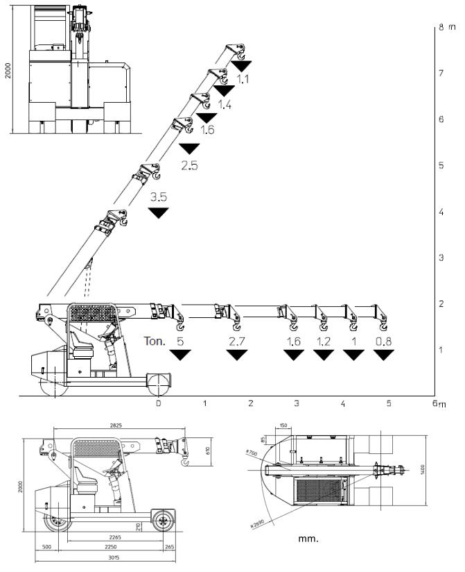 起吊臂:五節臂: 1節固定式, 2節液壓伸縮臂, 2節手動伸縮臂。各伸縮臂間都安裝有尼龍滑塊,其中一側為可調節滑塊