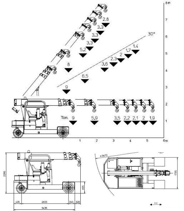 LMI ( 重量檢測指示系統 ): 實時電子式重量指示器,實時顯示起吊的重量,最大允許重量, 傾斜百分, 起吊的半徑, 角度, 伸縮臂和燈光指示